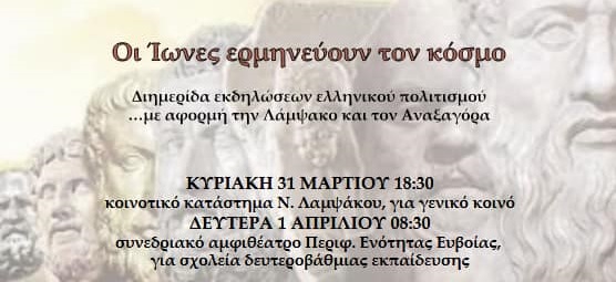 Ο Δήμος Χαλκιδέων, σε συνεργασία με τη Διεύθυνση Δευτεροβάθμιας Εκπαίδευσης Ν. Εύβοιας, τον Μορφωτικό – Εξωραϊστικό Σύλλογο Ν. Λαμψάκου «Αναξαγόρας», το Εργαστήρι Καλλιτεχνικής Παιδείας, την αστική μη κερδοσκοπική εταιρεία «Μύηση στον Ελληνικό Πολιτισμό» και με την υποστήριξη της Περιφερειακής Ενότητας Εύβοιας, διοργανώνουν Διήμερο Εκδηλώσεων Ελληνικού Πολιτισμού, με τίτλο «Οι Ίωνες ερμηνεύουν τον κόσμο», με αφορμή το επίκαιρο πολιτισμικό αποτύπωμα της Αρχαίας Λαμψάκου και του προσωκρατικού φιλοσόφου Αναξαγόρα.