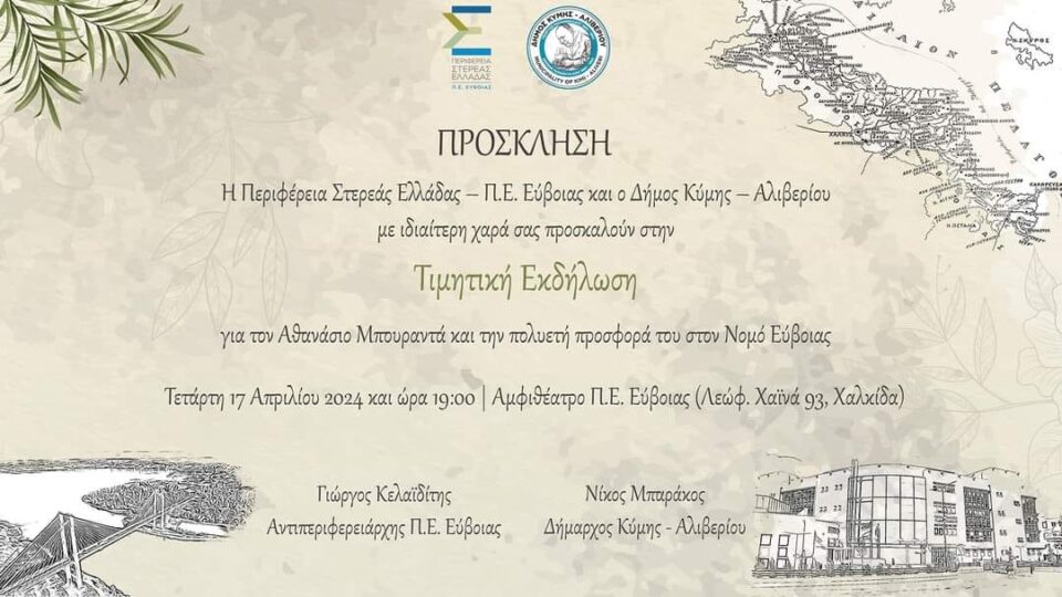 Η Περιφέρεια Στερεάς Ελλάδας, η Περιφερειακή Ενότητα Εύβοιας και ο Δήμος Κύμης – Αλιβερίου διοργανώνουν εκδήλωση για να τιμήσουν τον Θανάση Μπουραντά για την πολυετή προσφορά του στην Τοπική Αυτοδιοίκηση και στον Νομό Εύβοιας.