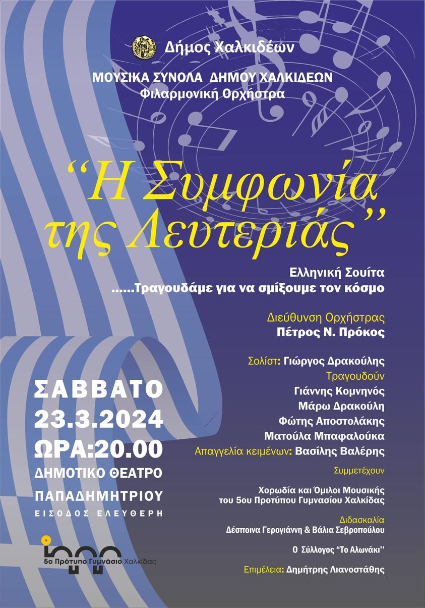 Για ακόμη μια χρονιά, τα Μουσικά Σύνολα του Δήμου Χαλκιδέων, ενόψει της Εθνικής Επετείου της 25ης Μαρτίου, βρίσκονται σε καλλιτεχνικό «συναγερμό» και παραθέτουν τη συναυλία «Η Συμφωνία της Λευτεριάς – Ελληνική Σουίτα», το Σάββατο 23 Μαρτίου 2024 και ώρα 20:00, στο Δημοτικό Θέατρο Παπαδημητρίου. Η είσοδος είναι ελεύθερη.