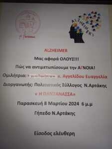 Ο Πολιτιστικός σύλλογος Νέας Αρτάκης “Η Παντάνασσα”, διοργανώνει μια ξεχωριστή ομιλία με θέμα το Alzheimer, μια από τις μάστιγες των σύγχρονων καιρών. Το γεγονός θα πραγματοποιηθεί την Παρασκευή 8 Μαρτίου στις 6 μ.μ. στα γραφεία του συλλόγου.