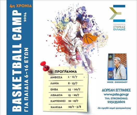 Για 4η συνεχή χρονιά, η Περιφέρεια Στερεάς Ελλάδας, σε συνεργασία με τον αγαπημένο πρωταθλητή και νυν προπονητή Νίκο Οικονόμου, διοργανώνει τα Basketball Camps σε όλη την Περιφέρεια.