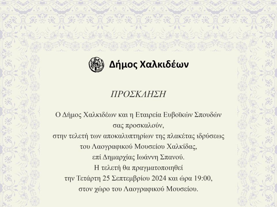 Η Χαλκίδα ετοιμάζεται να γιορτάσει μια σημαντική στιγμή για την πολιτιστική της κληρονομιά. Σήμερα, Τετάρτη 25 Σεπτεμβρίου 2024, στις 7 το απόγευμα, θα πραγματοποιηθεί η τελετή αποκαλυπτηρίων της πλακέτας ιδρύσεως του Λαογραφικού Μουσείου Χαλκίδας, επί Δημαρχίας Ιωάννη Σπανού.